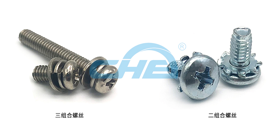 組合螺絲是指一個螺絲配一個彈墊再配一個平墊,通過搓牙,組合緊固在一起的組合件。二組合是指一個螺絲只配一個彈墊或只配一個平墊。還可以有只配一個花齒的二組合件。